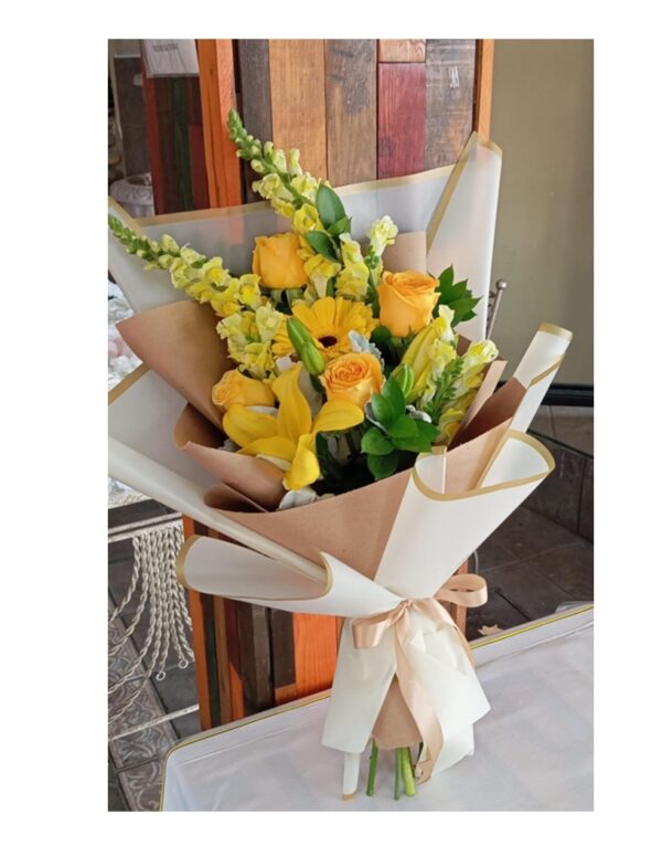 BOUQUET CON VARIEDAD DE FLORES EN TONO AMARILLO QUE PUEDE LLEVAR: GERBERA , ALSTROMERIAS LILIS, MARGARITAS, FOLLAJE, ETC.