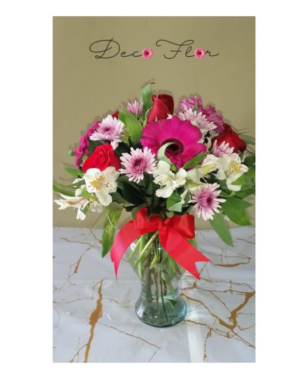 DISEÑO EN JARRON, CON ROSAS ROJAS, GERBERAS Y COMPLEMENTOS